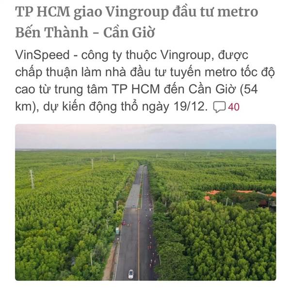 VinSpeed - công ty thuộc Vingroup, được chấp thuận làm nhà đầu tư tuyến metro tốc độ cao từ trung tâm TP HCM đến Cần Giờ (54 km), dự kiến động thổ ngày 19/12.