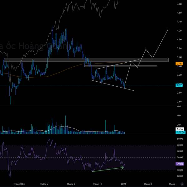 HQC đang hình thành mẫu broadening bottom rất rõ, với các phiên nỗ lực vượt cản KL lớn nhưng thất bại, giá giảm với KL cũng giảm theo. Hiện đã có tới 2 đoạn phân kỳ RSI. Khả năng cao sẽ sớm bật và trở...Thêm