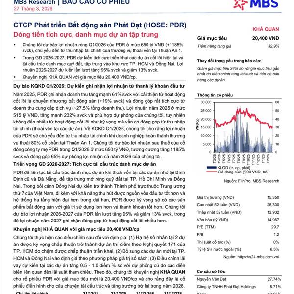PDR - MBS Research khuyến nghị KHẢ QUAN với giá mục tiêu 20.400 VNĐ/cp, dự báo lợi nhuận ròng Q1/2026 bùng nổ đạt 650 tỷ VNĐ (+1.185% svck) nhờ thoái vốn dự án Thuận An 1 thu về 1.900 tỷ đồng.
