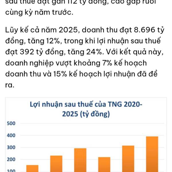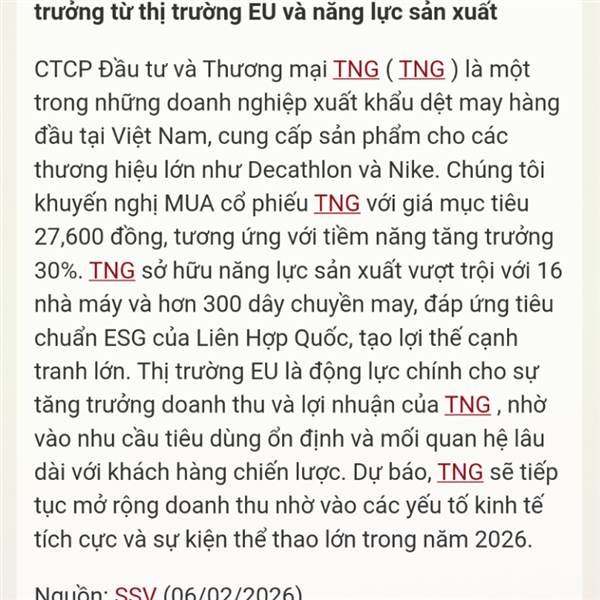Thị phần: TNG có lợi nhuận 111.59 tỷ , đứng thứ 4 trong ngành sản xuất sản phẩm may mặc công nghiệp.