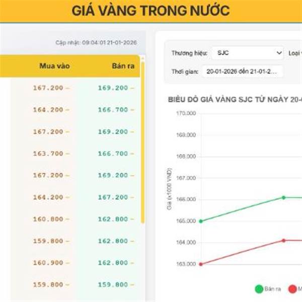 Giá vàng hôm nay 21/01/2026: Vàng trong nước tăng vọt, SJC áp sát 169,2 triệu/lượng