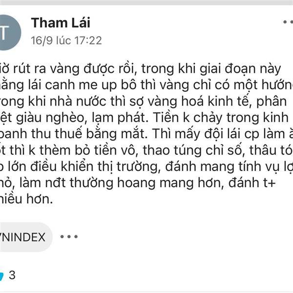 Với lối đánh khôn lỏi của lái ch.ó vn thì cho dù đánh lên 3000 cũng được, mà k ai tham gia nhé, thanh khoản lồi lõm càng teo, có giảm giá cp mãi cũng không hấp dẫn, vì uy tín nhà nước thấp. Lối đánh “...Thêm