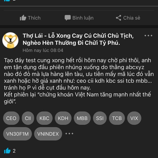 Tạo đáy test cung xong hết rồi hôm nay chờ phi thôi, anh em tận dụng đầu phiên nhúng xuống do thằng abcxyz nào đó đỏ mà lựa hàng lên tàu, ưu tiên mấy mã lúc đó vẫn xanh hoặc hở giá xanh như: ceo cii k...Thêm