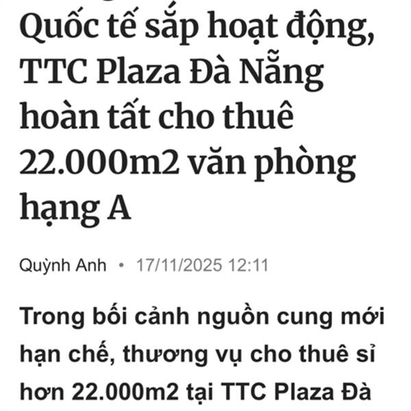 Trong bối cảnh nguồn cung mới hạn chế, thương vụ cho thuê sỉ hơn 22.000m2 tại TTC Plaza Đà Nẵng ...Thêmnguoiquansat.vn/...m2-van-phong-hang-a-255427.html