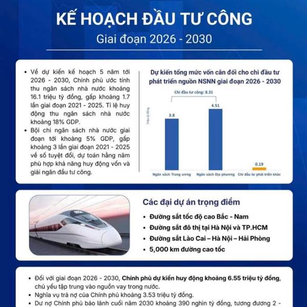 Đầu tư hạ tầng nhiệm kỳ 2026 - 2030 cao gấp 3 lần 2021 - 2025. Vốn đầu tư ra xã hội năm năm tới là cực kỳ lớn. Chính phủ quyết tâm tận dụng giai đoạn này để đưa VN nhảy vọt trước khi dân số già hóa. C...Thêm