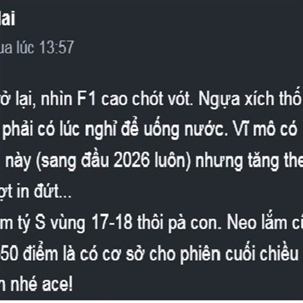 Lâu rồi mới trở lại, nhìn F1 cao chót vót. Ngựa xích thố ngày đi ngàn dặm thì cũng phải có lúc nghỉ để uống nước. Vĩ mô có lẽ còn tăng dài cho con sóng này (sang đầu 2026 luôn) nhưng tăng theo kiểu Vi...Thêm
