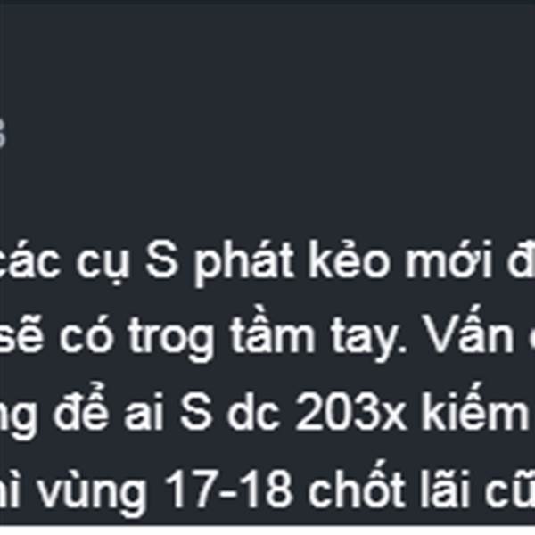 Quan điểm psinh ngày 12.12! Vẫn quan điểm từ 2 hôm trước, S từ 6x cứ mạnh dạn ôm thôi, mới có 50đ nhẹ. Vững tay chèo S vào. Ít nhất là 0x, còn sâu hơn nữa tính sau. Nó lên xuống biên chục điểm kệ nó, c...Thêm