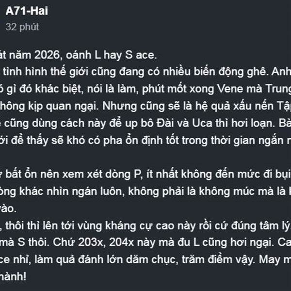 Mở bát năm 2026, oánh L hay S ace. Có vẻ tình hình thế giới cũng đang có nhiều biến động ghê. Anh cả vẫn có gì đó khác biệt, nói là làm, phút mốt xong Vene mà Trung và Nga không kịp quan ngại. Nhưng cũ...Thêm