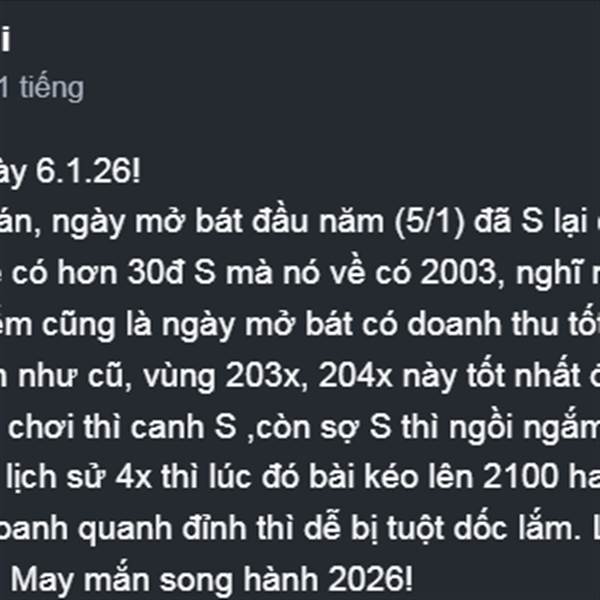 Quan điểm ngày 6.1.26! Hài, nghĩ ló chán, ngày mở bát đầu năm (5/1) đã S lại còn đoán sai. Dự về 2000 để có hơn 30đ S mà nó về có 2003, nghĩ nó cay thật. Thôi thì vài chục điểm cũng là ngày mở bát có d...Thêm