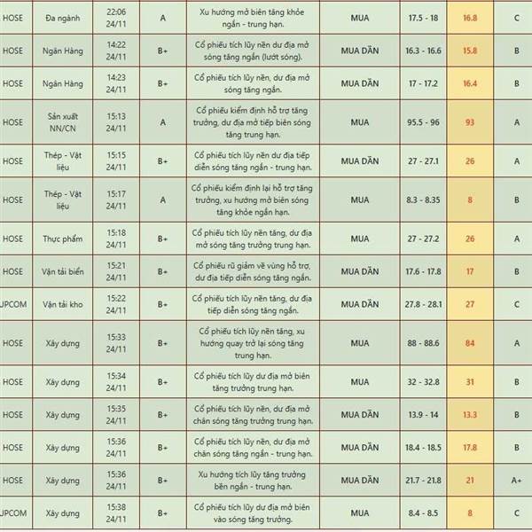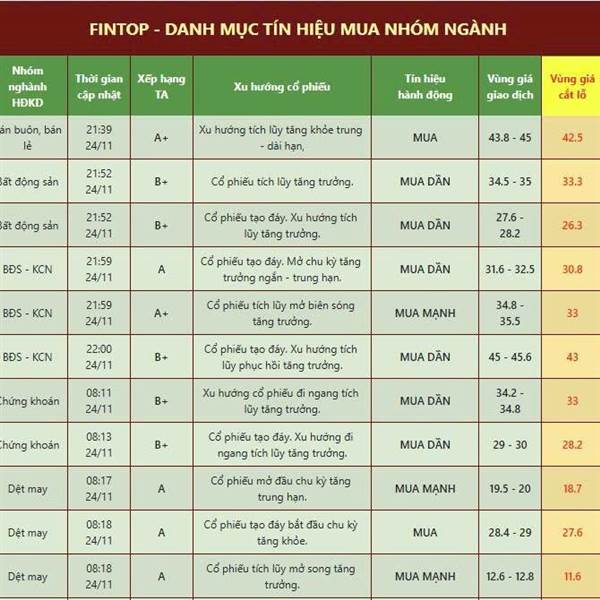 TOP cổ phiếu danh mục TÍN HIỆU MUA các nhóm Ngành phiên NAY 25/11