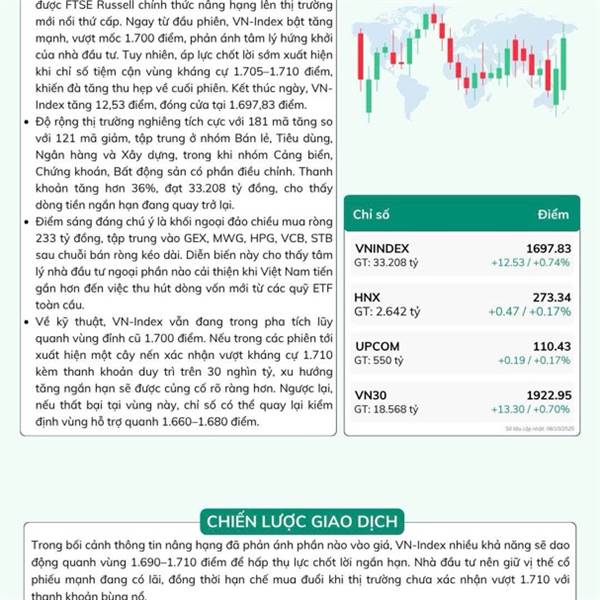 Chào buổi sáng anh chị, Phiên hôm qua thị trường đã phản ứng khá tích cực trước thông tin Việt Nam được nâng hạng chính thức, khi VN-Index tăng 12.53 điểm lên 1,697...Thêm