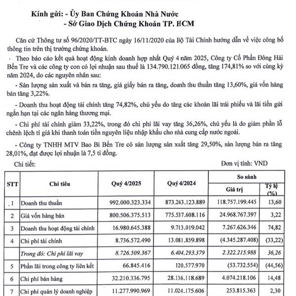Quý 4-2025 giấy Đông Hải Bến Tre đạt lợi nhuận sau thuế 134 tỷ đồng, tăng 174% so với cùng kỳ.