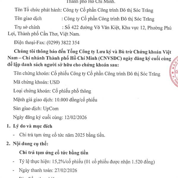Công trình đô thị Sóc Trăng USD tạm ứng cổ tức 1.520đ năm 2025 cho anh em có tiền ăn Tết.