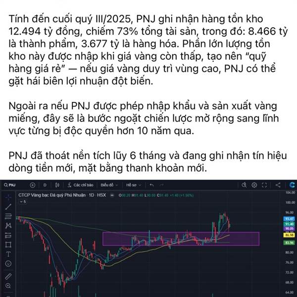 PNJ kéo tăng 50% từ đáy, cổ phiếu điều chỉnh không phải vì yếu, cũng chưa phải gãy trend. Hạ nhiệt do câu chuyện chung giá vàng, cách mà NĐT phản ứng hơi quá. Còn thực tế vận độ...Thêm