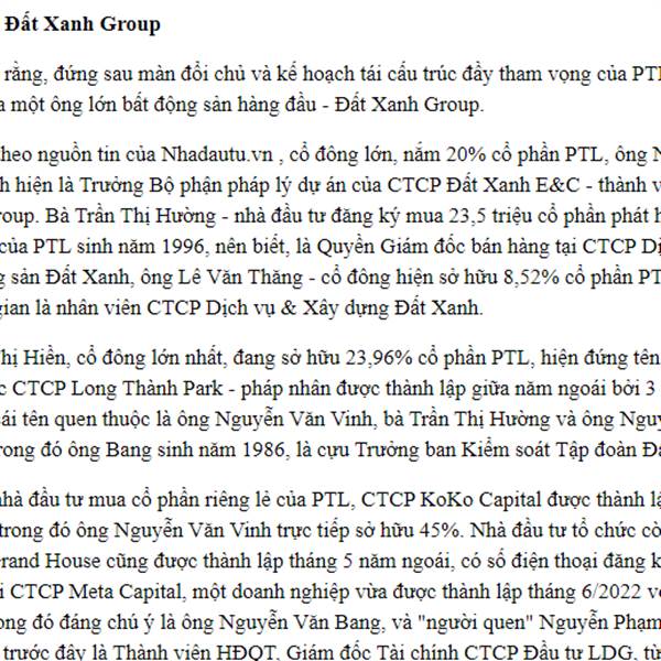 Sự hiện diện dày đặc của nhiều cá nhân có liên quan tới Đất Xanh Group là diễn biến đáng chú ý tại PTL. Sau nhiều năm chìm trong thua lỗ, sự xuất hiện mới của nhóm cổ đông với đầy đủ tiềm lực, tâm huyết hứa hẹn sẽ vực dậy doanh nghiệp một thời từng thuộc ngành dầu khí.