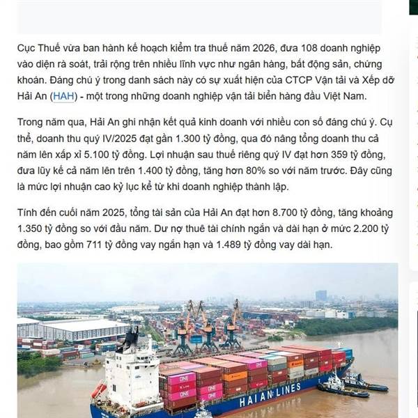 Vừa báo lãi kỷ lục, doanh nghiệp vận tải biển 10.000 tỷ bất ngờ vào diện kiểm tra thuế