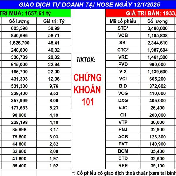 Ngày 12/1/2025 tự doanh BÁN ròng: -275.47 tỷ (bao gồm khớp lệnh và thỏa thuận)