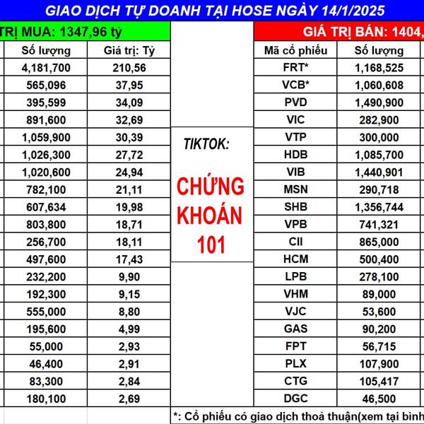 Ngày 14/1/2025 tự doanh BÁN ròng: -56.16 tỷ (bao gồm khớp lệnh và thỏa thuận)