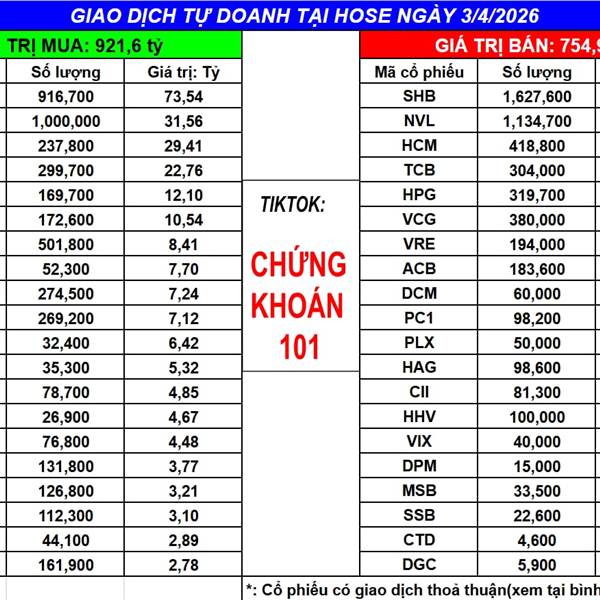 Ngày 3/4/2025 tự doanh MUA ròng: 166.62 tỷ (bao gồm khớp lệnh và thỏa thuận)