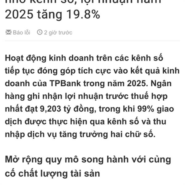 Hoạt động kinh doanh trên các kênh số tiếp tục đóng góp tích cực vào kết quả kinh doanh của TPBank trong năm 2025. Ngân hàng ghi nhận lợi nhuận trước thuế hợp nhất đạt 9,203 tỷ đồng, trong khi 99% giao dịch được thực hiện qua kênh số và thu nhập dịch vụ tăng trưởng hai chữ số.