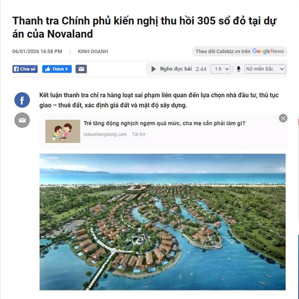 - Thanh tra Chính phủ kiến nghị thu hồi 305 Giấy chứng nhận quyền sử dụng đất (Sổ đỏ) tại dự án NovaBeach Cam Ranh.
