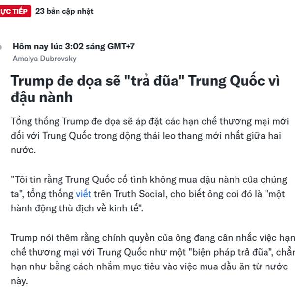 Hôm trước thì Trump đe dọa vụ TQ vụ hạn chế xuất khẩu đất hiếm và khoáng sản chiến lược → TQ bom hàng đậu nành → Hôm nay Trump đe dọa trả đũa vụ TQ bom hàng đậu nành Mỹ.