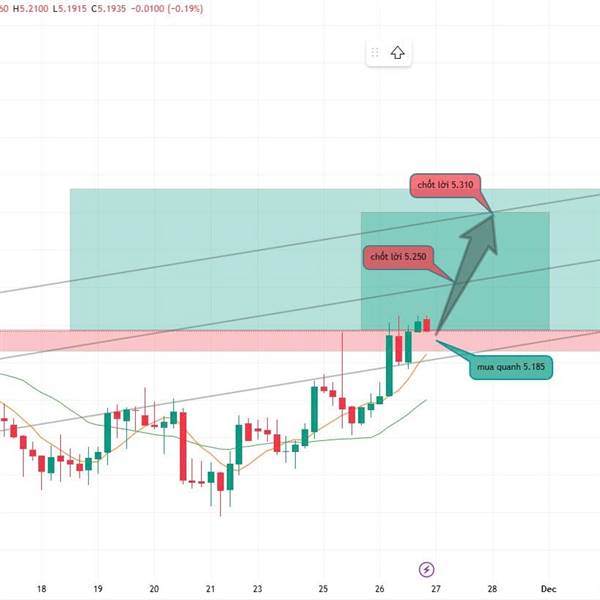 🔹 Xu hướng chính: Tăng ngắn hạn – giá duy trì trên MA7–21 và vượt vùng cung 5.165–5.195.
