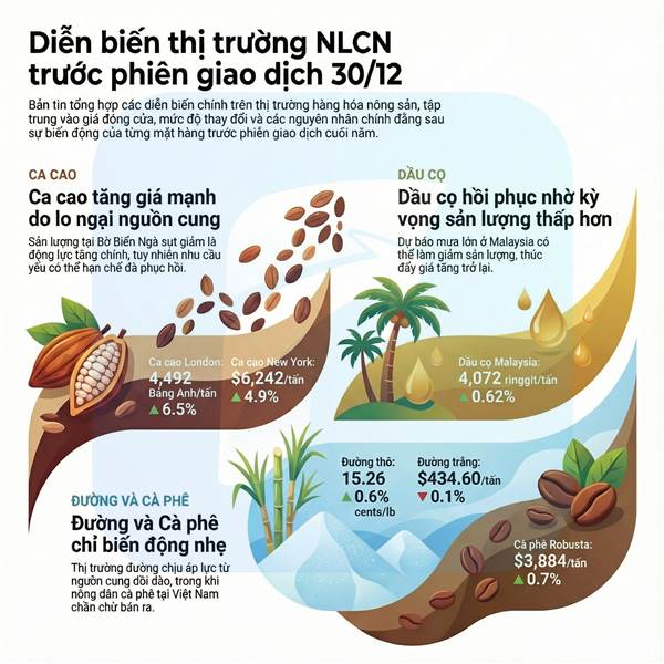 Theo số liệu từ Hiệp hội các nhà xuất khẩu (GEPEX), sản lượng nghiền cacao của Bờ Biển Ngà trong tháng 11 đã giảm 6,7% so với cùng kỳ năm ngoái, xuống mức 56.696 tấn. Tính lũy kế từ đầu niên vụ 2025/2...Thêm