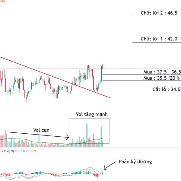 + Sau đó dòng tiền bắt đầu tham gia mở mua mạnh và có nhịp rũ back test lại kênh giảm.