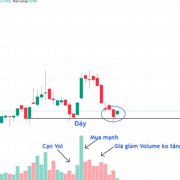 + Ở nhịp giảm trước giá giảm Volume thấp ( Cạn Vol).