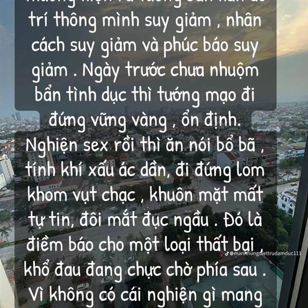 Những người nghiện sex cũng thường hiện ra tướng bần hàn do trí thông mình suy giảm, nhân cách suy giảm và phúc báo suy giảm. Ngày trước chưa nhuộm bẩn tình dục thì tướng mạo đi đứng vững vàng, ổn địn...Thêm