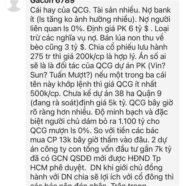 Cái hay của QCG. Tài sản nhiều. Nợ bank ít (ls tăng ko ảnh hưởng nhiều). Nợ người liên quan ls 0%. Định giá PK 6 tỷ $ . Loại trừ các nghĩa vụ nợ. Bán lúa non thu về bèo cũng 3 tỷ $. Chia cổ phiếu lưu ...Thêm