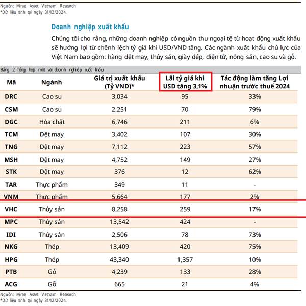 Chúng tôi cho rằng, những doanh nghiệp có nguồn thu ngoại tệ từ hoạt động xuất khẩu sẽ hưởng lợi từ chênh lệch tỷ giá khi USD/VND tăng. Các ngành xuất khẩu chủ lực của Việt Nam bao gồm: hàng dệt may, ...Thêm