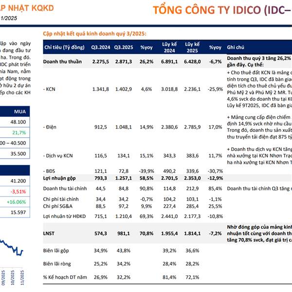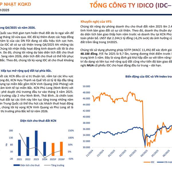 Chúng tôi sử dụng phương pháp SOTP (WACC 11,4%) để xác định giá trị hợp lý của IDC và đưa ra mức giá mục tiêu là 48.100 đồng. P/E fw 2025 là 9,7 lần, tương đương thời điểm trước khi xảy ra sự kiện thu...Thêm