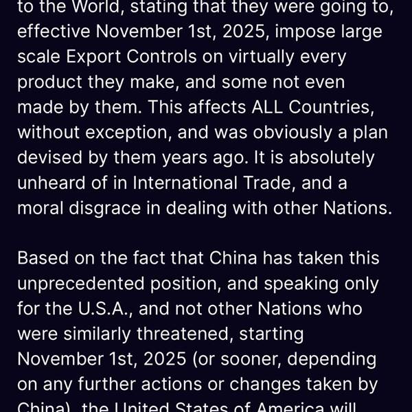 Bắt đầu từ ngày 1 tháng 11 năm 2025 (hoặc sớm hơn, tùy theo hành động tiếp theo của Trung Quốc), Hoa Kỳ sẽ áp đặt mức thuế quan 100% đối với Trung Quốc, ngoài các mức thuế mà họ đang phải chịu hiện na...Thêm