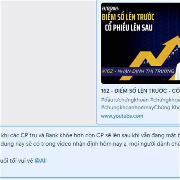 Trở lại với TT sau kì nghỉ lễ sẽ có giai đoạn tới các DN công bố Báo cáo tài chính của quý 4 và cả năm 2025. Đây được xem là 1 chủ đề chính và ảnh hưởng nhiều đến diễn biến ngắn hạn của TT. Vậy cần lư...Thêmhttps://www.youtube.com/watch?v=B9GRfBONNNU