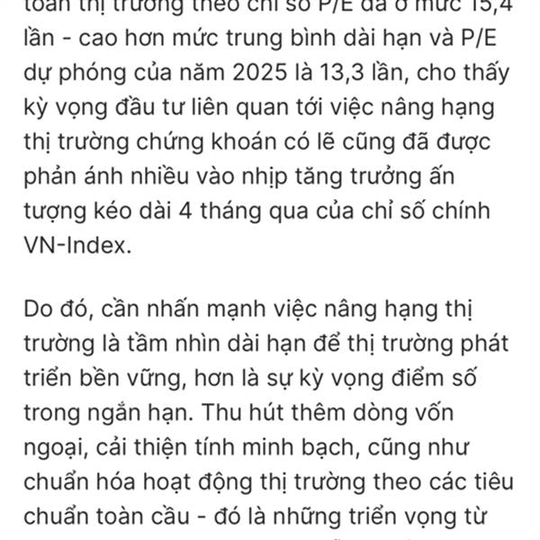 Việt Nam hiện đang được xếp loại là thị trường cận biên (Frontier Market) và đã được đưa vào Danh sách Theo dõi (Watch List) từ tháng 9 năm 2018 để xem xét khả năng nâng hạng lên thị trường mớ...Thêm