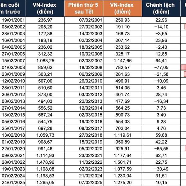 Thống kê 10 năm (2015–2025): 9/10 lần VN-Index tăng điểm sau tuần đầu hậu Tết → Xác suất nghiêng về kịch bản tích cực.