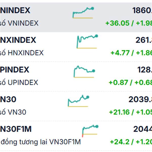 VN-Index tăng +36 điểm (+1.98%) so với phiên trước kỳ nghỉ, đóng cửa quanh 1.860 điểm.