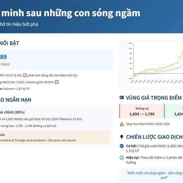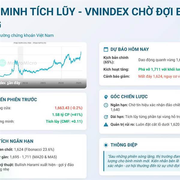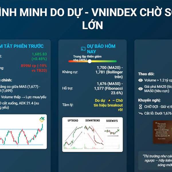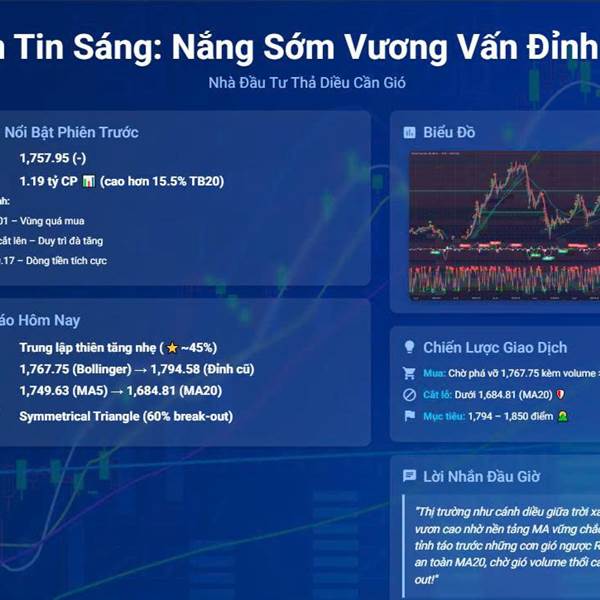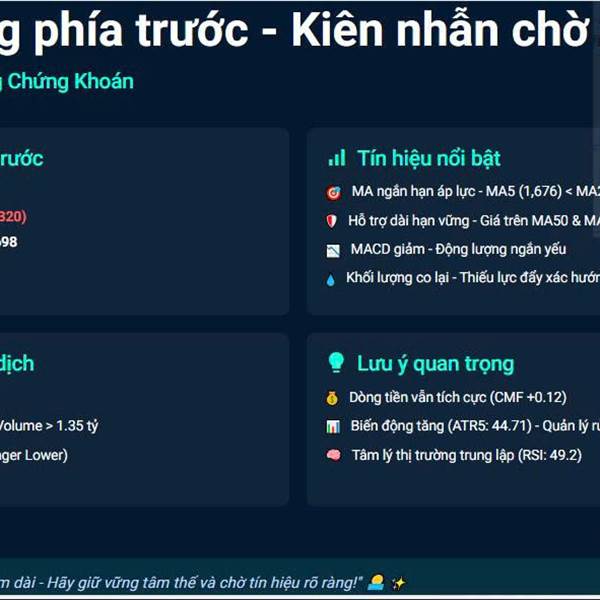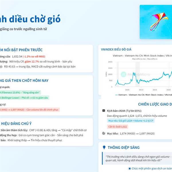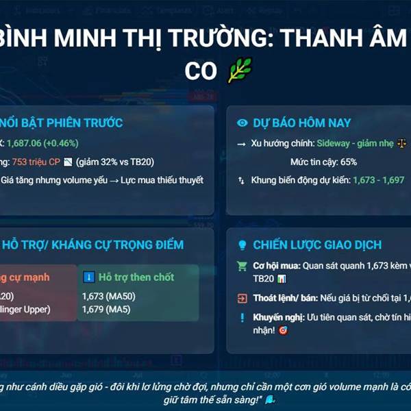 📈 ĐIỂM NỔI BẬT PHIÊN TRƯỚC • VNINDEX: 1,687.06 (+0.46%) • Khối lượng: 753 triệu CP 📉 (giảm 32% vs TB20) • Tín hiệu: Giá tăng nhưng volume yếu → Lực mua ...Thêm
