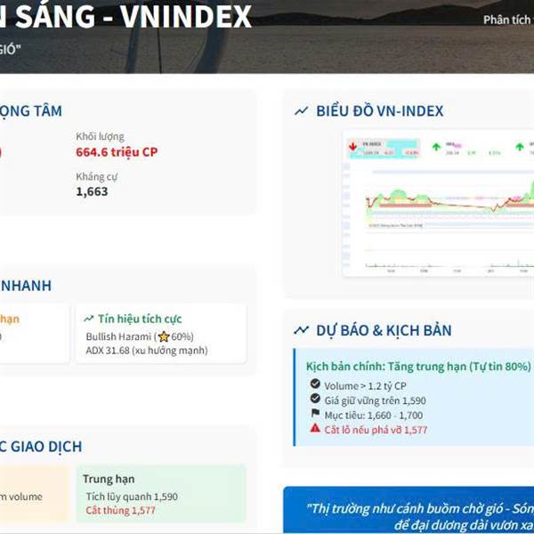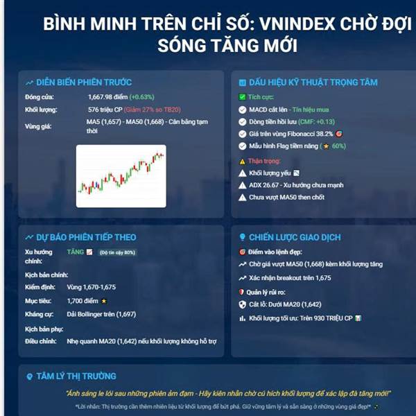 BÌNH MINH TRÊN CHỈ SỐ: VNINDEX CHỜ ĐỢT SÓNG TĂNG MỚI --- 📊 DIỄN BIẾN PHIÊN TRƯỚC - Đóng cửa: 1,667.98 điểm (📈 +0.63%) - Khối lượng: 576 triệu CP (📉 Giảm 27% so TB20) - Vùng giá: MA5 (1,657) - MA50 (1,66...Thêm