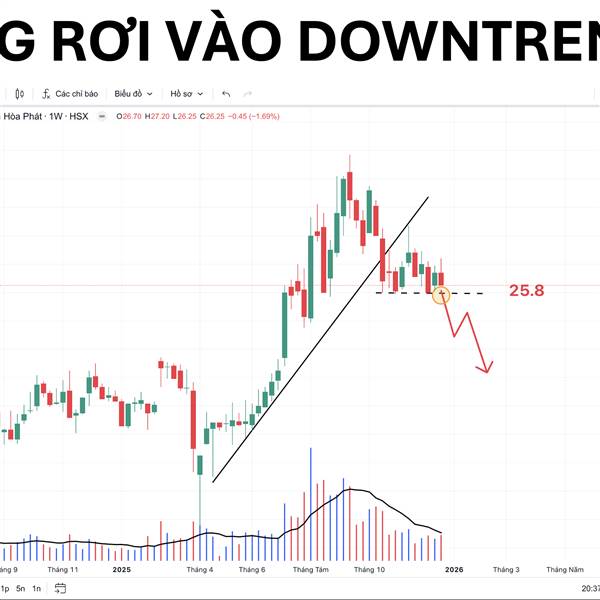 Hiện tại HPG đang gãy xu hướng tăng và đang tích lũy đi ngang quanh vùng 26. Nếu theo lý thuyết được học từ sách giáo khoa :" Khi cổ mà gãy Trendline mà hồi lên tiếp...Thêm