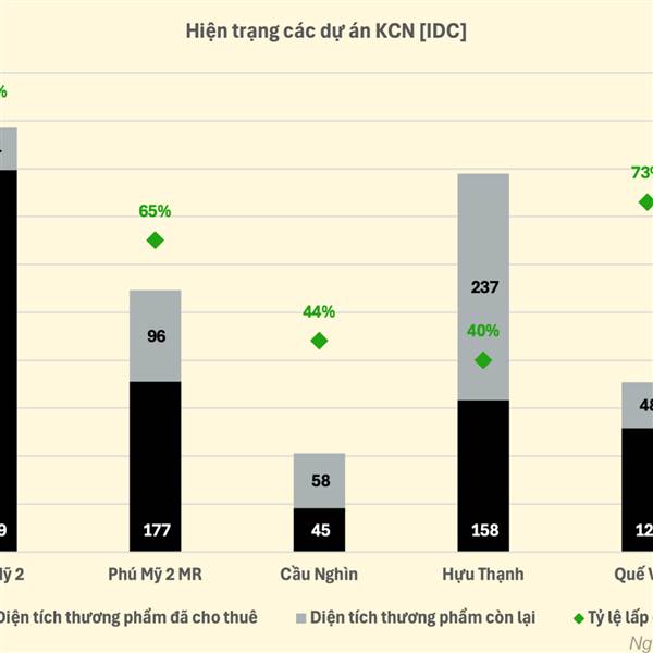 Tính đến cuối năm 2024, IDC còn khoảng 482 ha đất thương phẩm sẵn sàng cho thuê tại 5 khu công nghiệp trọng điểm. Trong đó, Phú Mỹ 2 đã đạt tỷ lệ lấp đầy khoảng 90%, khiến tiến độ cho thuê tại dự án n...Thêm