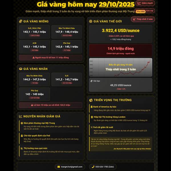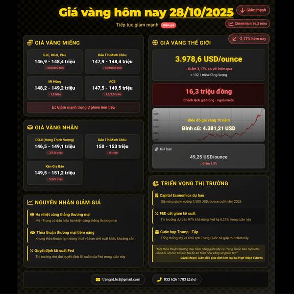 💰 GIÁ VÀNG HÔM NAY (28/10/2025): TRƯỢT DỐC MẠNH – VÀNG THẾ GIỚI PHÁ MỐC 4.000 USD