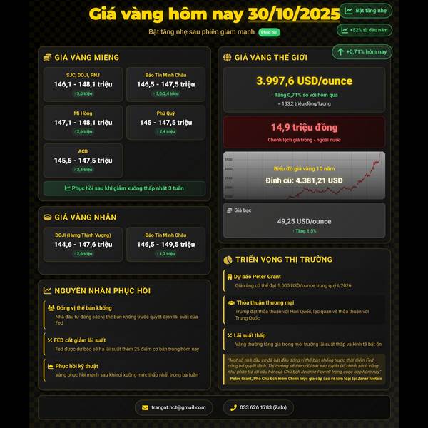 ✨ GIÁ VÀNG HÔM NAY (30/10/2025): VÀNG TĂNG TRỞ LẠI -TÍN HIỆU TÍCH CỰC SAU CHUỖI NGÀY ẢM ĐẠM