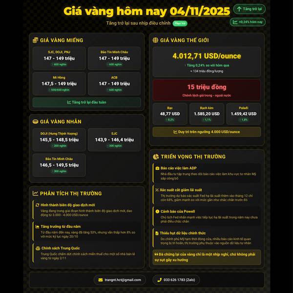 📈✨ GIÁ VÀNG HÔM NAY (03/11/2025): NHIỀU TÍCH HIỆU LẠC QUAN ĐẦU TUẦN MỚI