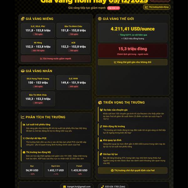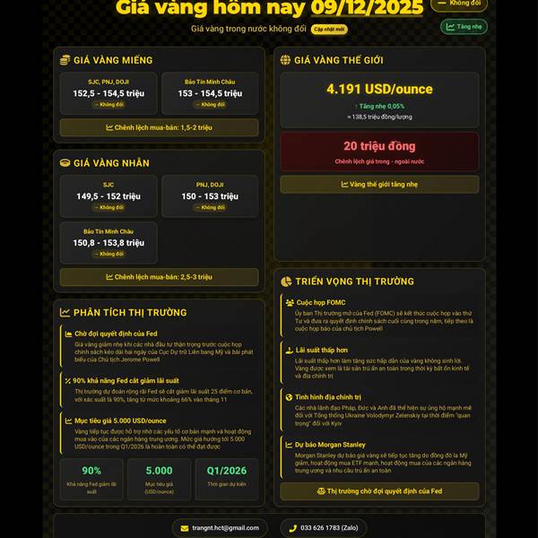 🪙📈 GIÁ VÀNG HÔM NÀY (09/12/2025): KHÔNG CÓ THAY ĐỔI NHIỀU SO VỚI GIÁ ĐÓNG CỬA HÔM QUA
