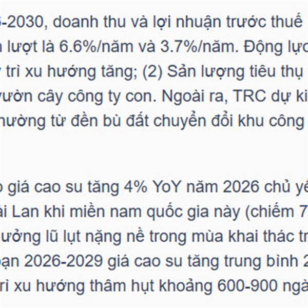 Đã có bên dự phóng TRC năm 2026 tới đây lợi nhuận có thể cán mốc 1000 tỷ nhờ tăng trưởng do giá bán cao su tăng cao và khoản tiền đền bù đất khu công nghiệp.