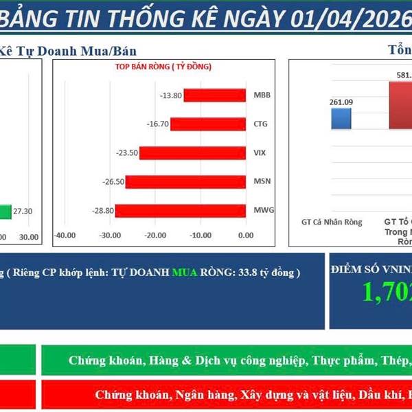 Tự Doanh ngày 01/04/2026 - Tự Doanh MUA RÒNG : 42.3 tỷ đồng Riêng CP khớp lệnh : TỰ DOANH MUA RÒNG : 33.8 tỷ đồng + Top MUA ròng : VIC, SHB, PVT + Top BÁN ròng : MWG, MSN, VIX