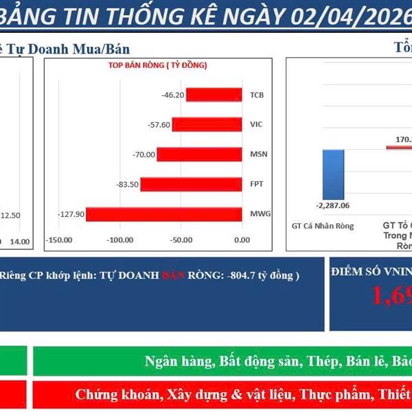 Tự Doanh ngày 02/04/2026 - Tự Doanh BÁN RÒNG : -820 tỷ đồng Riêng CP khớp lệnh : TỰ DOANH BÁN RÒNG : -804.7 tỷ đồng + Top MUA ròng : VIX, VHM, GVR + Top BÁN ròng : MWG, FPT, MSN